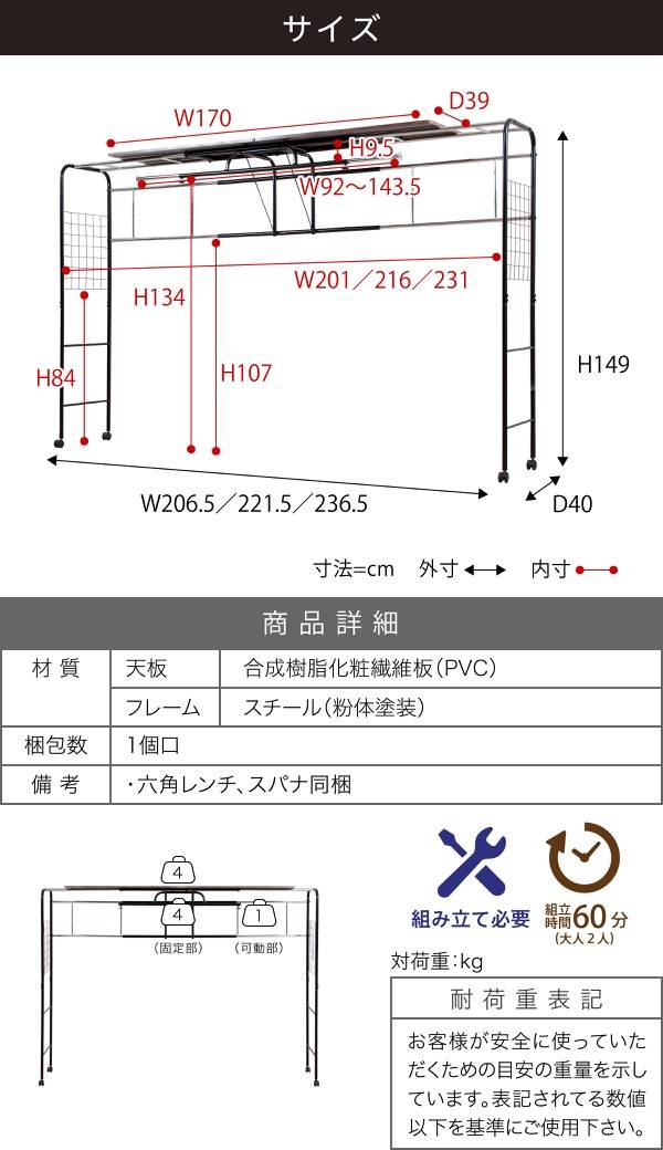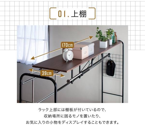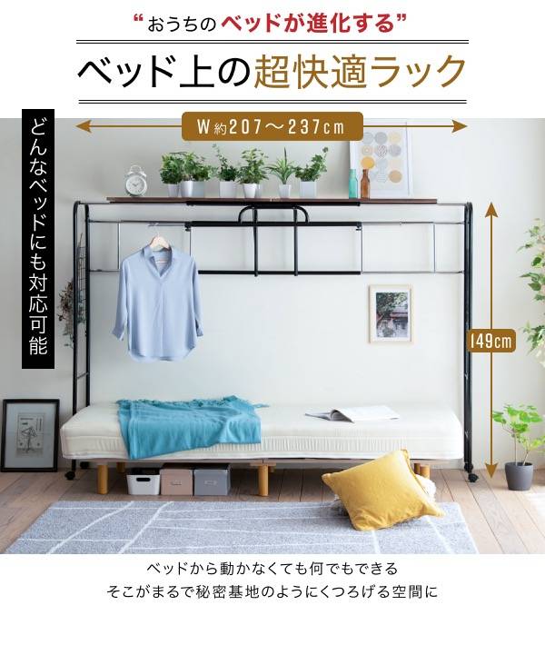 ベッド用 ハンガー ラック ベッド上 棚 収納 キャスター付き 伸縮式 上棚 奥行き40 高さ149 ブラック ダークブラウン ハンガーラック 収納付き 衣類 スチール
