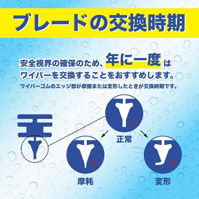 ※ワイパーの払拭性能や撥水効果が低下してきたら早めの交換をおすすめします。