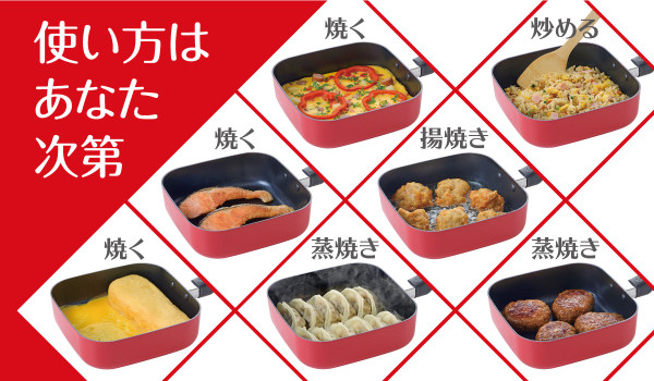 手軽に使えるサイズ感が丁度良い、四角いフライパンです。炒める、焼く、煮る、蒸し焼き、揚げ焼きなど色々な料理に使えます。狭いキッチンでも使えるコンパクトなサイズ感です。お弁当のおかず作りなどのちょっとした料理にも役立ちます。