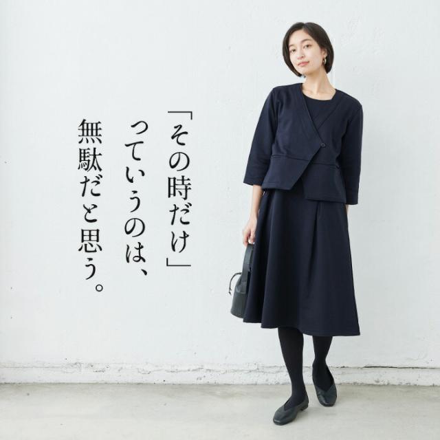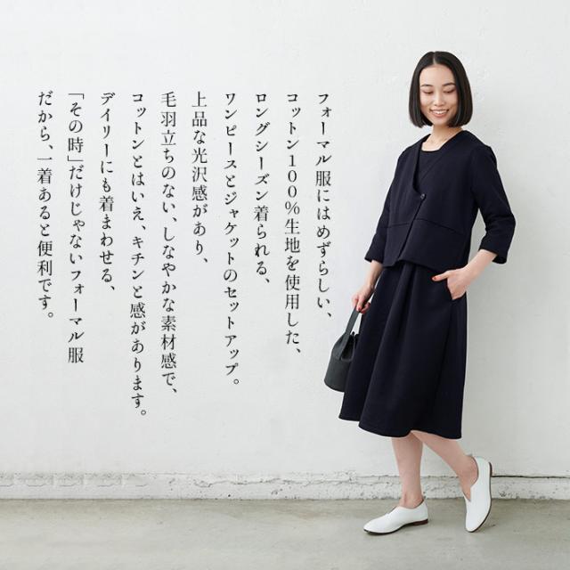特徴 フォーマル服にはめずらしい、コットン100%生地を使用した、ロングシーズン着られる、ワンピースとジャケットのセットアップ。上品な光沢感があり、毛羽立ちのない、しなやかな素材感で、コットンとはいえ、キチンと感があります。デイリーにも着まわせる、「その時」だけじゃないフォーマル服だから、一着あると便利です。