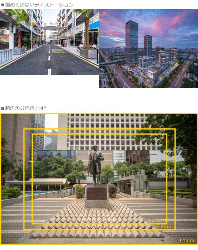 114°もの超広角な画角にもかかわらず、極めて優れたシャープな画像を提供します。極めて広い画角により、新たな写真表現が可能です。