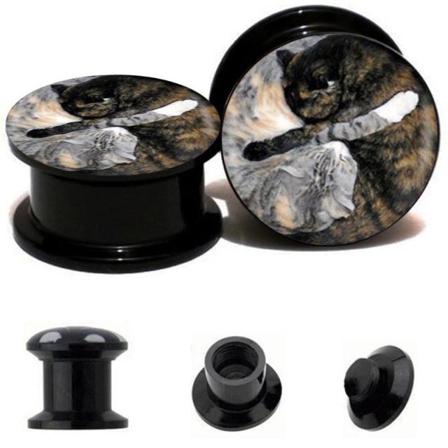 ダブルフレアの黒のアクリルプラグに2匹の猫で陰陽をデザインした可愛いボディピアス。