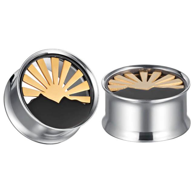 太陽が山から上る朝日をモチーフにしたステンレス製のダブルフレア型ボディピアス。