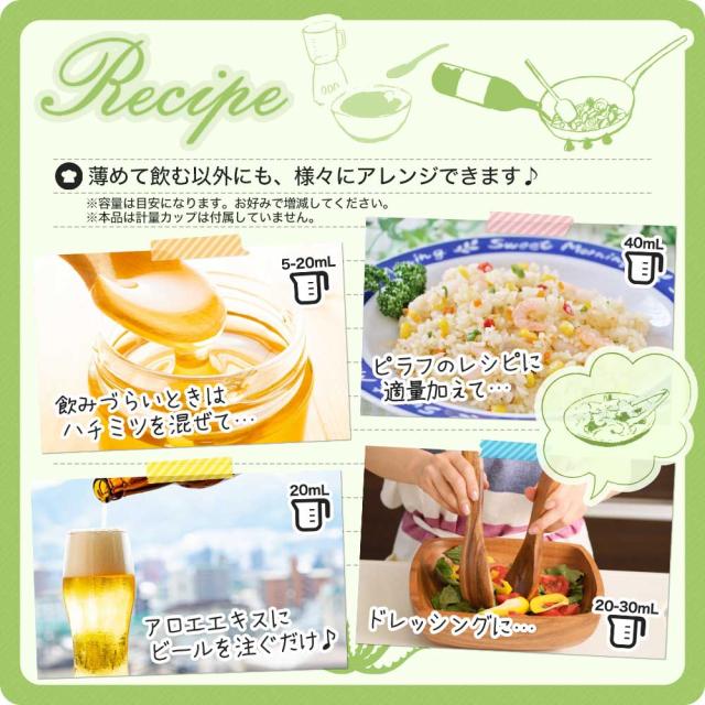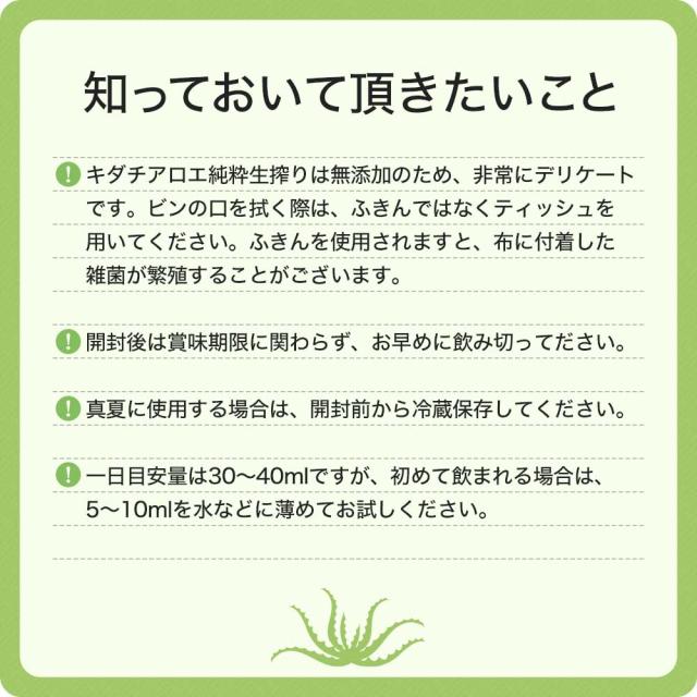 | ●健康補助飲料として、一日30〜40mlを目安に数回に分け、そのままお召し上がりになるか、またはお好みにより水や他の飲料などに加えてご飲用ください。 ●空腹時に大量にお召し上がりにならずに、最初は少量よりご飲用ください。 ●吟味された原料を使用しているため、キダチアロエ独特の苦味がありますが、品質には問題ありません。 |