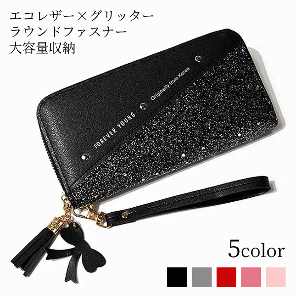 キラキラ 長財布 レディース ラウンドファスナー グリッター ラメ エコレザー 異素材 ポケット ロングウォレット じゃばら 蛇腹 シール コラージュ 紙資材 収納 カード入れ ケース かわいい 大容量
