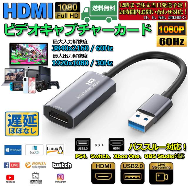 HD hdmi キャプチャーボード パススルー対応 1080P 60Hz ゲームキャプチャー USB2.0 ビデオキャプチャカード ゲーム実況生配信、画面共有、録画、ライブ会議に適用 小型軽量 Nintendo Switch、Xbox One、OBS Studio対応 電源不要