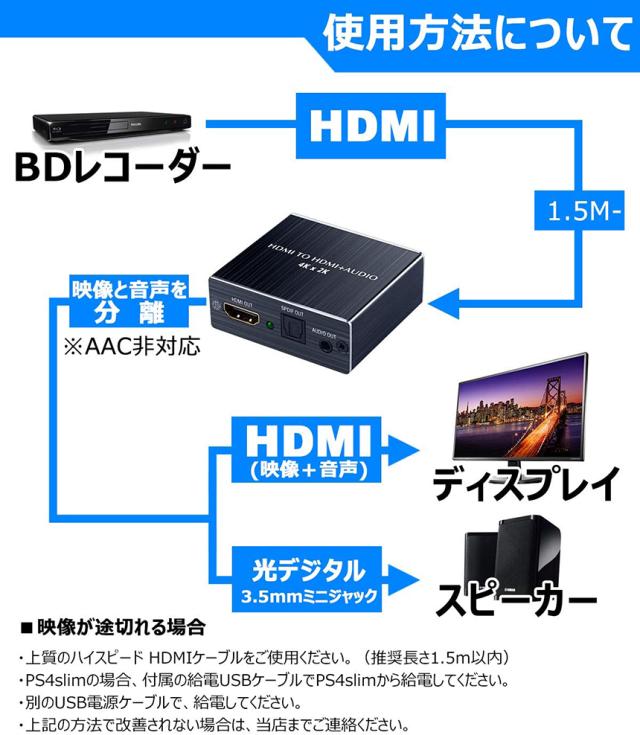 【HDMI1.4対応サウンド分離器】本機はHDMI入力信号に含まれる「映像」と「音声」を分離し、映像はHDMI出力端子(音声を含む)からテレビ・モニターに出力しつつ、音声は光デジタル端子、または3.5mmステレオミニジャックからオーディオシステムなどに出力します。※HDMI出力も音声信号を流れます、不要な場合はディスプレイの音量を「0」にご調整ください。