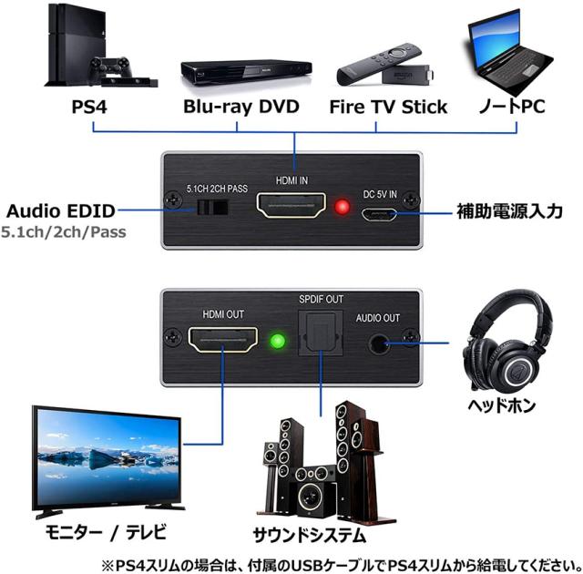【音声出力2系統搭載】さまざまなオーディオソースに対応するため「光デジタル」と「3.5mmステレオミニジャック」の2系統を搭載しています。PS4Slimなどに「光デジタル出力端子」がなくて、ディスプレイに内蔵スピーカーがなくって困っている方に、本商品を介して、ステレオアンプや5.1chホームシアターセットなどのオーディオシステムと接続することができ、映画やゲームなどの音声を迫力のサウンドで楽しむことが実現します。