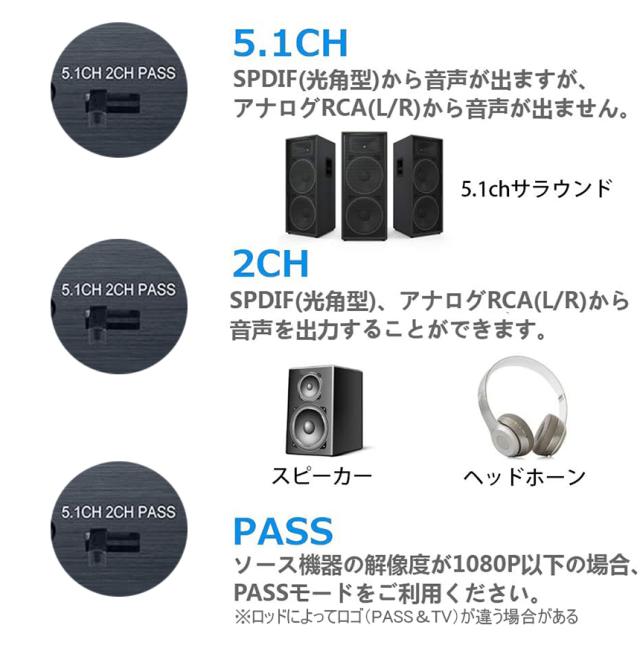 【EDID音声モード搭載】オーディオモードは接続機器によって「PASS」「5.1CH」「2CH」が切り替えられます(変換機能はありません)。【対応音声フォーマット】「光デジタル」Dolby-AC3 2ch/5.1ch,DTS 2ch/5.1ch,LPCM 2ch;「3.5mmステレオ」PCM/LPCM 2chのみ ※それ以外の音声フォーマットには対応しません。※AACにも非対応。