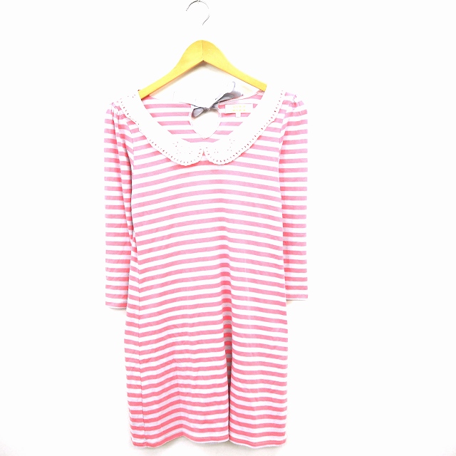 【中古】ミニマム MINIMUM ワンピース ボーダー しましま レース 丸首 ひざ丈 長袖 コットン 綿 2 ピンク グレー