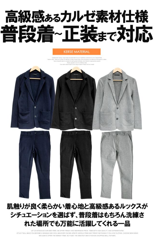 | 説明 | よく伸びて締め付け感の少ない着心地がよいストレッチのあるカルゼ素材を使用したセットアップです。 すっきりとした着丈とシルエットで合わせやすい一枚です。 カジュアルな着こなしから、フォーマルまで対応できる上品ながらもオシャレを忘れないセットアップは大活躍すること間違い無しです。 シンプルに洗練されたデザインがワンランク上の着こなしを演出するセットアップです。 |