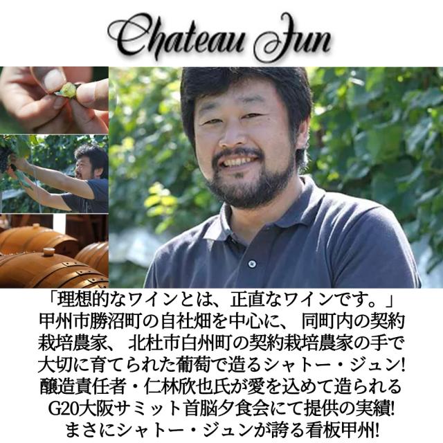 「理想的なワインとは、正直なワインです。」甲州市勝沼町の自社畑を中心に、 同町内の契約栽培農家、 北杜市白州町の契約栽培農家の手で大切に育てられた葡萄で造るシャトー・ジュン!醸造責任者・仁林欣也氏が愛を込めて造られるG20大阪サミット首脳夕食会にて提供の実績!まさにシャトー・ジュンが誇る看板甲州!