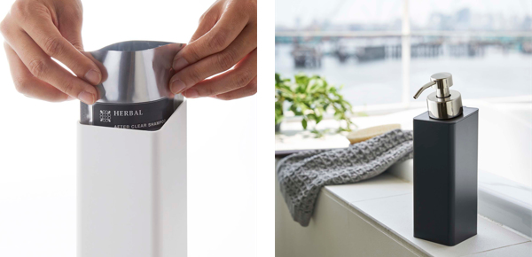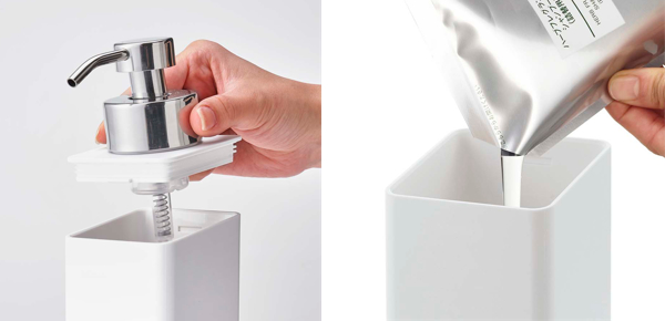 | 詰め替え袋OK 詰め替え用袋をそのまま入れることもできます。 | 置いても使える 壁面に付けずに置いた状態でもお使いいただけます。 |