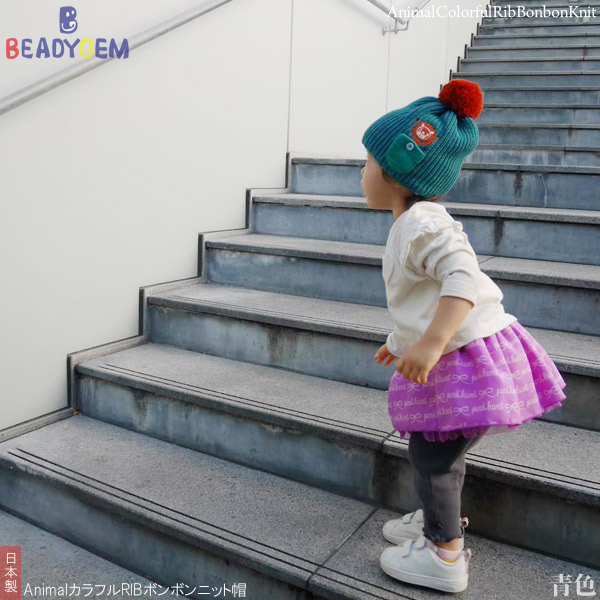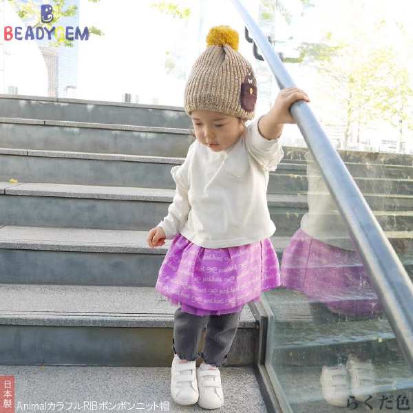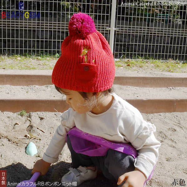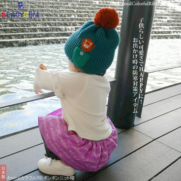 ニット帽 キッズ [メール便可] 帽子 子供用 ポンポン 防寒 女の子 男の子 動物 秋冬 / キッズ AnimalカラフルRIBボンボンニット帽 日本製
