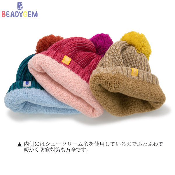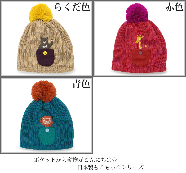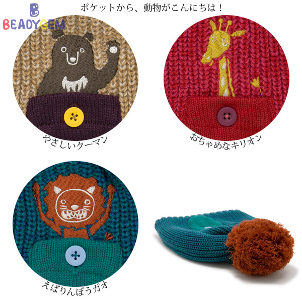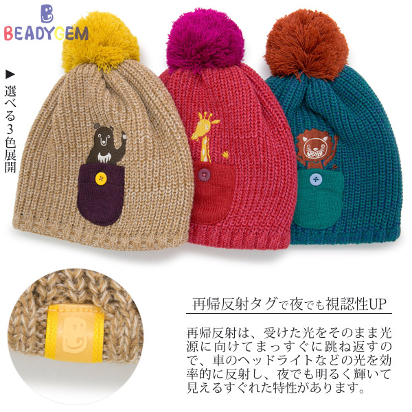 キッズらしいカラフルな色の組み合わせがポイントの日本製ニット帽を入荷しました。表側のポケットからは、やさしいクーマン・おちゃめなキリオン・えばりんぼうガオのキャラクターが顔をのぞかせていて、とても可愛いです。内側にはシュークリーム糸を使用しているのでふわふわで暖かく防寒対策も万全です。また、再帰反射素材のタグ付きで暗がりの中でもお子様の安全を守ってくれますよ☆(※再帰反射は、受けた光をそのまま光源に向けてまっすぐに跳ね返すので、車のヘッドライトなどの光を効率的に反射し、夜でも明るく輝いて見えるすぐれた特性があります。)