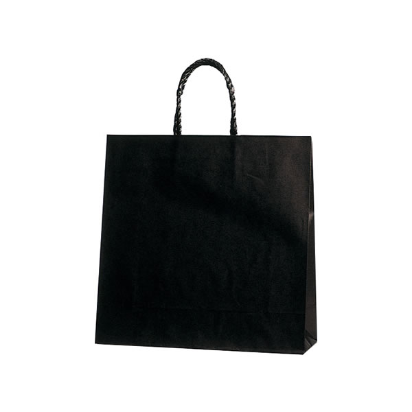 樹脂製の接着剤で手紐を取り付けた手提げ紙袋です。紐の結び目がなくすっきりし、物の出し入れがスムースで、ストックする際にかさばらないメリットがあります。正面の見た目が正方形のオールマイティモデル。シックな黒無地。●手紐:PP紐黒●入数:25枚