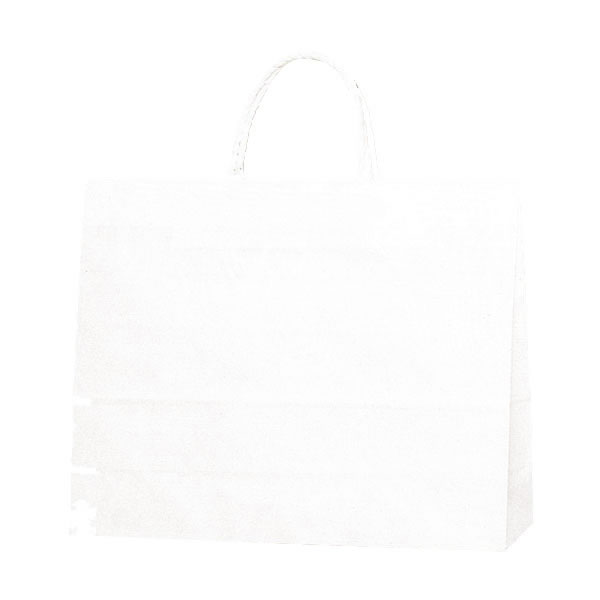 樹脂製の接着剤で手紐を取り付けた手提げ紙袋です。紐の結び目がなくすっきりし、物の出し入れがスムースで、ストックする際にかさばらないメリットがあります。小柄な方に嬉しい横型フォルム。汎用性の高い白無地。●手紐:PP紐白●入数:25枚