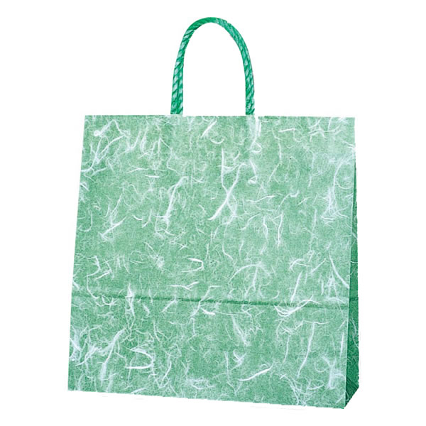 樹脂製の接着剤で手紐を取り付けた手提げ紙袋です。紐の結び目がなくすっきりし、物の出し入れがスムースで、ストックする際にかさばらないメリットがあります。正面の見た目が正方形のオールマイティモデル。日本の伝統和紙がモチーフで、和菓子や仏事などにも用いられます。●手紐:PP紐緑●入数:25枚