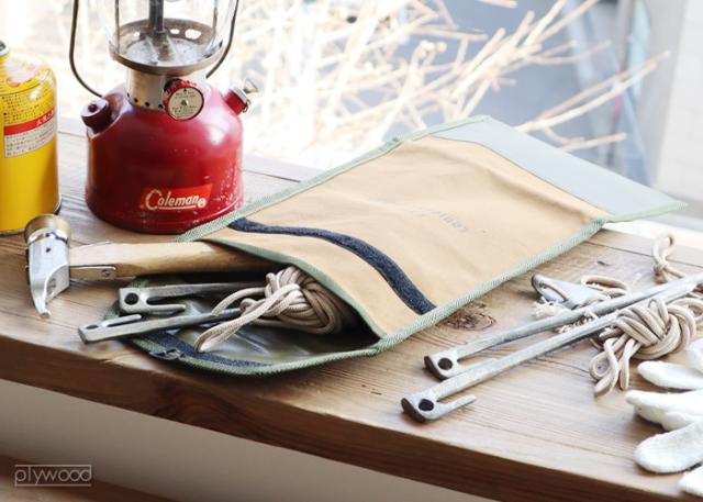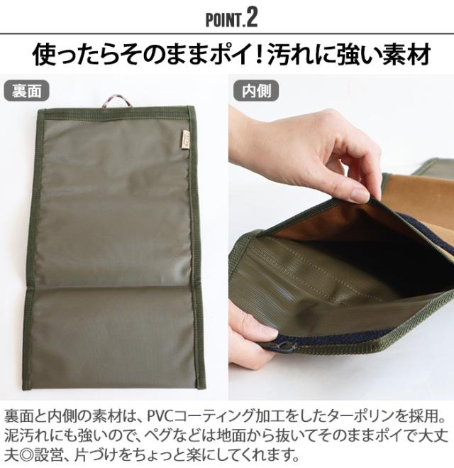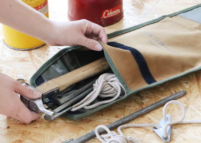 ペグやハンマーをまとめてガサッと入れられる、おしゃれな縦長のツールケース。綿とターポリンを重ねた強度に優れた素材を使用しているため、ガサツに放り込んでも大丈夫!さらに面ファスナーが付いているので、持ち運びの際に中身が出てしまうこともありません。内側と裏面はPVC加工されたターポリン素材なので、土や芝生の場所で使う際にも泥を落としやすく、まさにアウトドアにピッタリなツールケースです。