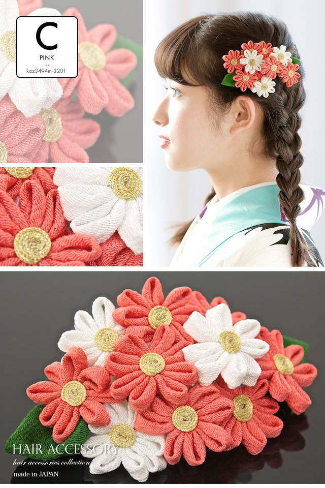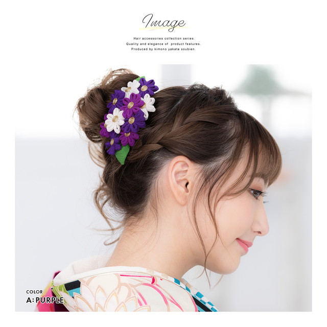 ぷっくりとした生地でつくられた花が美しい色味で可憐で可愛らしいヘアスタイルを彩ります。