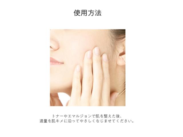 | 使用方法 | 適量を肌のキメに沿って均等に伸ばして塗った後、手のひらで優しくなじませます。 |