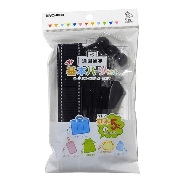 これひとつで通園通学に必要な基本アイテム5点(レッスンバッグ、シューズケース、体操着袋、お弁当袋、コップ袋)が作れます。レシピも付いたお得なパーツセット。