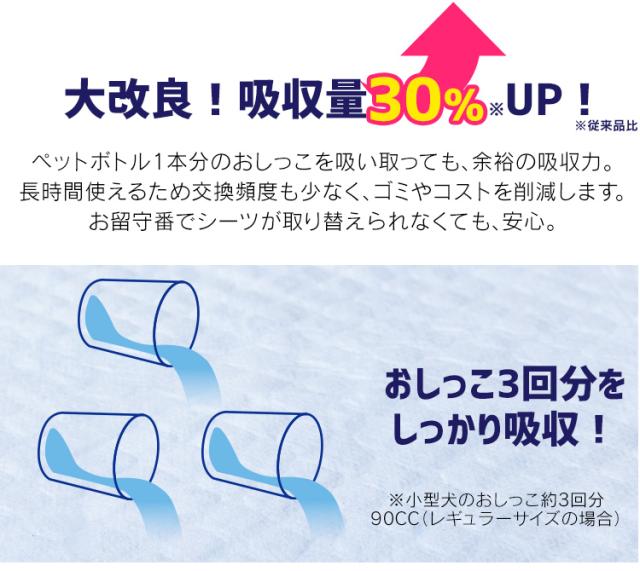 - うちのワンコは水をよく飲むので、オシッコも大量。働いているので朝から夕方まで交換できないこともあり、他のシートでは吸収しきれないことも多いです。いろいろ試しましたが、やっぱり吸収力が1番だと思います。
