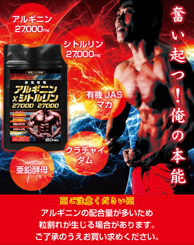 使用上の注意:薬を服用している方、通院中の方は担当専門医にご相談の上ご使用ください。アレルギー等のある方は原材料表示をご参照ください。妊娠・授乳中の方は、ご使用をお控え下さい。アルギニンとシトルリンを高濃度配合した打錠サプリメントのため、粒割れが生じる場合があります。粉状になっている場合はスプーン等ですくってご使用ください。