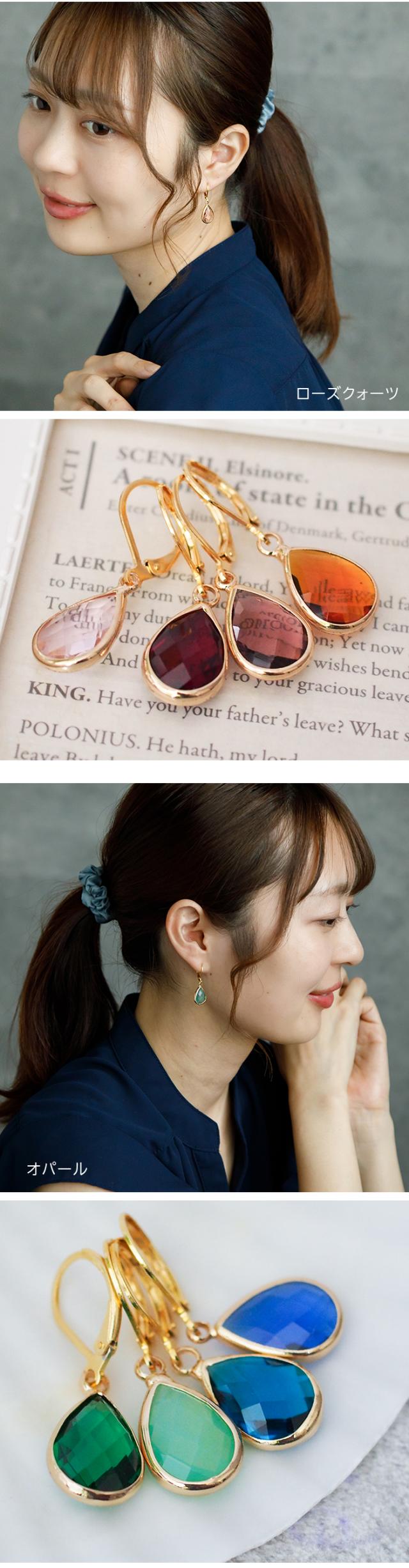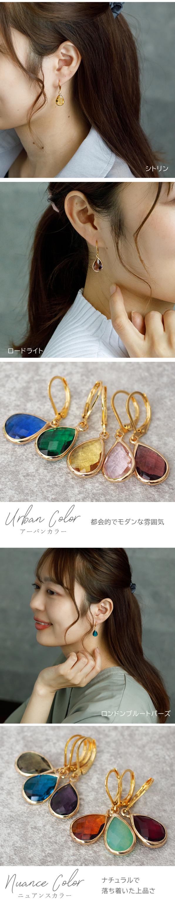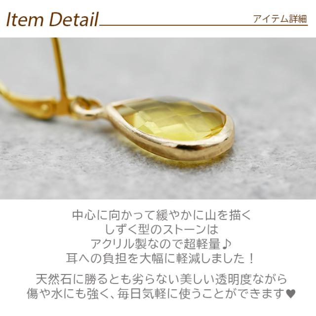 | 着脱簡単で引っかからない中折れフープとゆらゆら揺れるフックピアスの良いとこ取りな、まったく新しい形のフックピアスができました! ダイヤ型のカットがキラキラ反射してとってもきれい! 透明度の高いアクリル製のしずく型ストーンが、毎日をカラフルに明るく彩ります♪ |