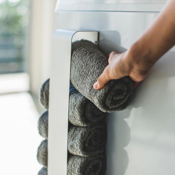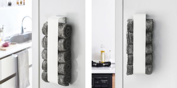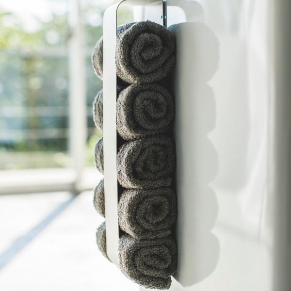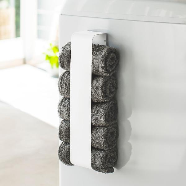 置き場所に困るタオルをくるっと丸めて、洗濯機の全面やすき間に収納できるタオルホルダーです。ホルダーはマグネットで取り付けできるので、設置場所の調整も簡単です。タオルをきれいに並べて「見せる収納」としておしゃれに収納できます。