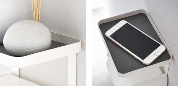 | 丈夫なスチール製 見た目、機能性だけでなく、材質にスチールを使用し、しっかりとした作りも魅力の一つです。 | 滑り止め付き トレーには滑りにくいシリコーンマットが付いています。 |