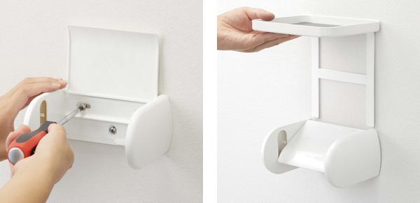 | 【1】 ご使用のトイレットペーパーホルダーのネジを少しだけ緩めます。(このとき、ネジを抜かないようにしてください) | 【2】 上からトレー部分をすき間に差し込んで、最後に緩めたネジを締め直します。 |