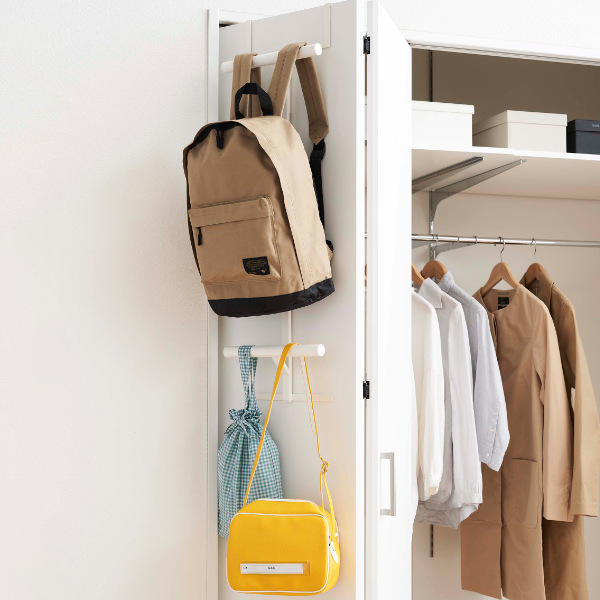 ランドセルやリュック、洋服や小物など用途に合わせて使い方自在の便利な上下2段ハンガーです。リュックやショルダーバッグ、ストールなど幅広く収納が可能で、お子様とご両親で一緒にお使いいただけます。