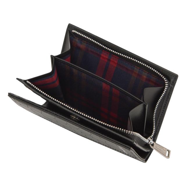 繊細な型のエンボスレザーとクロコのエンボスレザーを切り替えで組み合わせた表情のあるシリーズです。内側の良質なスムースレザーのあわせと裏地のチェック柄生地により、パトリックコックスらしいスタイリッシュな仕上がりとなっています。財布の開閉が楽なホック式折り財布です。札入れ部分の片側を浅く設計することで、「お札が深く入りすぎて取り出しにくい」という、縦長財布の不満点を解消しました。札入れ、小銭入れともに2層仕様になっており、お金の仕分けもしやすく使い勝手のよい仕上がりとなっています。