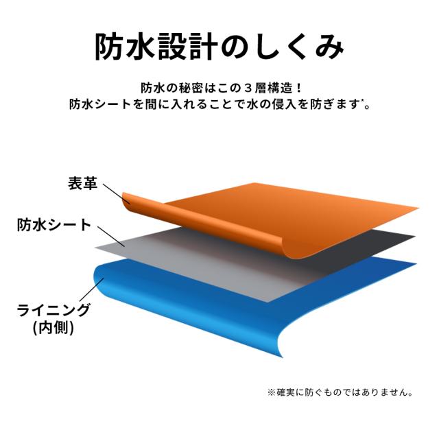 3層の生地構造である表皮とライニング(内側)の間に『防水フィルムシート』を挟み込んだ生地構成で、内部への水の染み込みを軽減。