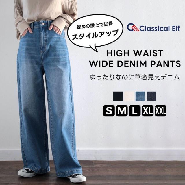 秋新作 クラシカルエルフ レディース 体型カバー 大きいサイズ 小さいサイズ パンツ ボトムス デニムパンツ ワイドパンツ 美脚 ハイウエスト ゆったり ce0900001