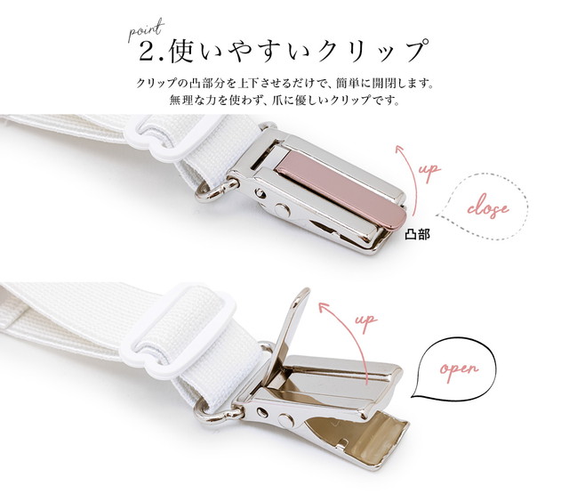 クリップは凹凸部分を上下させるだけで開閉でき、無理な力を使わず爪を痛めることがありません。