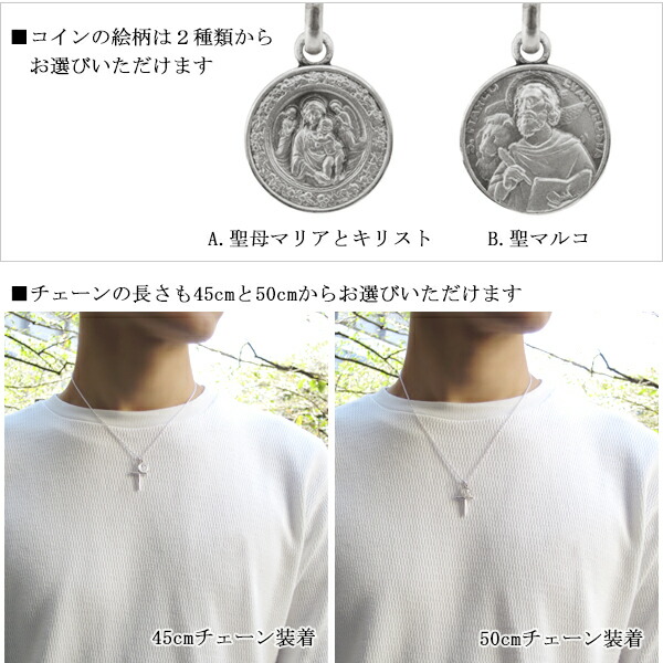 選べる2種類 コイン ラテンクロス ネックレス シルバー925 聖母マリア 聖マルコ 聖人 聖者 ヴェネツィアの獅子 ライオン メダル シンプル メンズ レディース