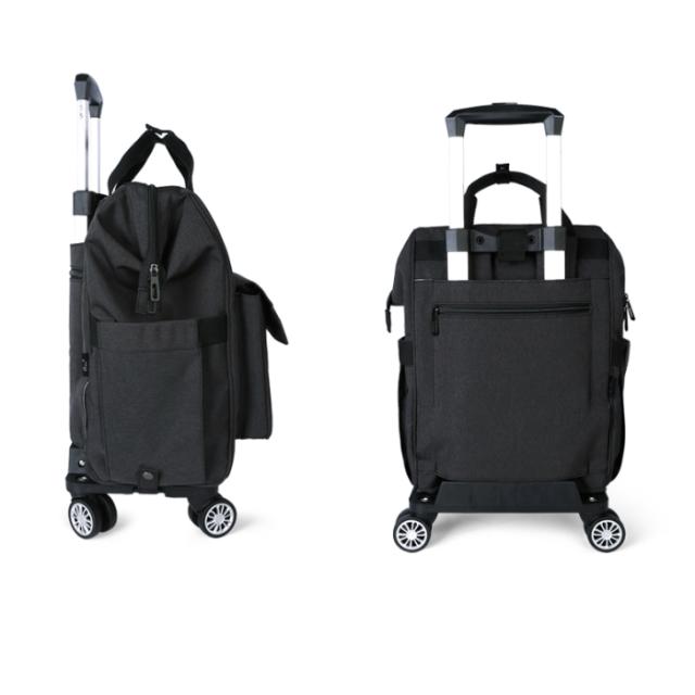 高い機能性とデザイン性を兼ね備えたリュック&キャリー です。 リュック単品としてもお使いいただけます。 キャリーバーの長さ(地上から)3段階調整が可能。 使わないときはキャリー台に折りたたみ可能。 ◇スーツ用の生地を採用し独特な素材感と上品さ溢れます。 さらに耐引裂・耐摩擦・撥水加工を施して丈夫で突然の雨でも安心。 雨に濡れてしまったらすぐに拭き取ります。 内側は防水素材です。 ◇摩耗、引き裂き、擦リ切れに強く、耐久性に優れています。 ◇背面全体とショルダーベルトが3Dメッシュパネル仕様。クッション性・通気性が抜群です。 特別なお出かけも楽しく安全に華やかなデザインのキャリーケース 。 ・男女兼用で使えるリュック&キャリーリュック!