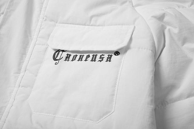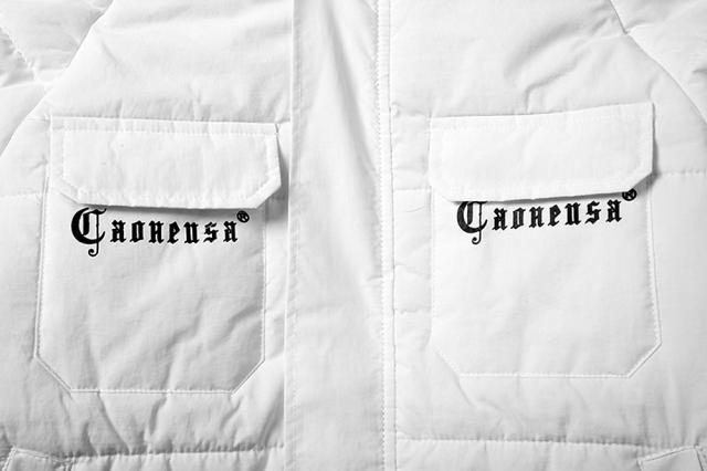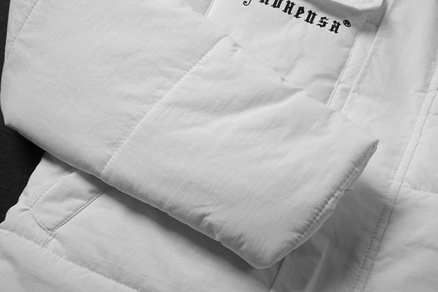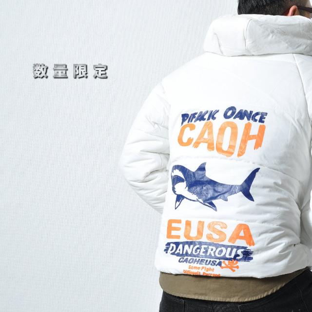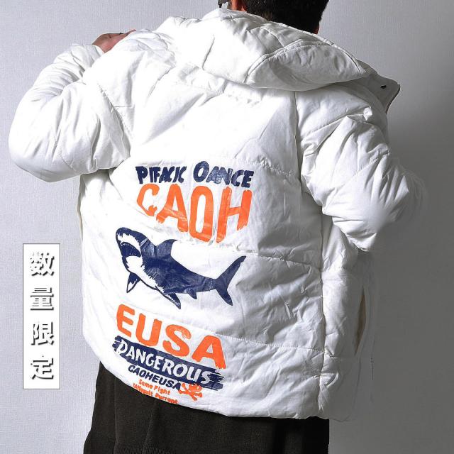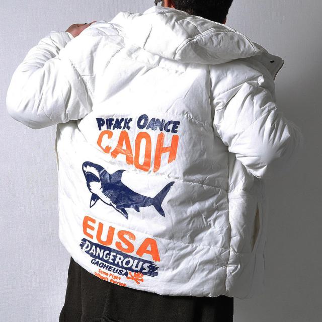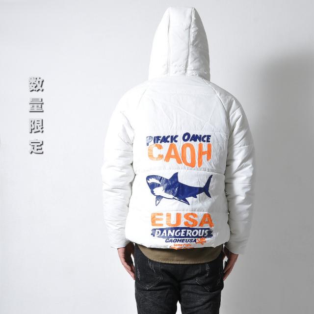 軽くてモコッとした着心地のフード付き中綿ジャケット両胸のポケットと背中にサメとロゴがプリントされています。