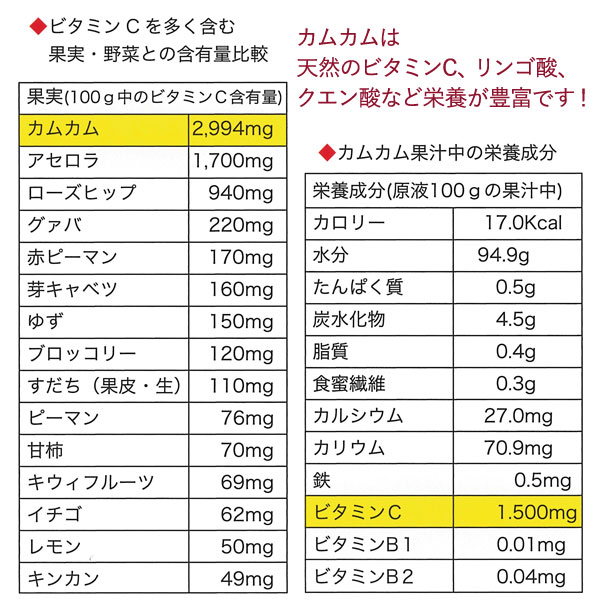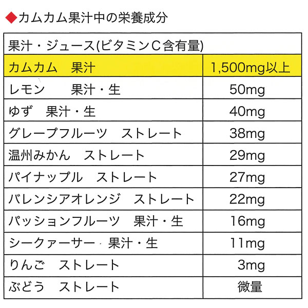カムカム粉末スプーン1杯(約2g)でビタミンCの1日の必要量が摂取できます。(100gあたりのビタミンC含有量は7,000mg)