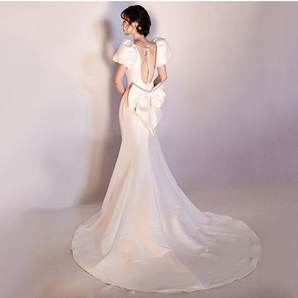 花嫁 ウェディングドレス ファスナー パフスリーブ マーメイドライン 白ドレス ワンピース 花嫁 結婚式 二次会 披露宴 前撮り 後撮り 撮影用 ビーチフォト フォトウェディング 小さいサイズ ドレス ロング トレーンドレス ウエディングドレス スレンダー dm059t2t2s3