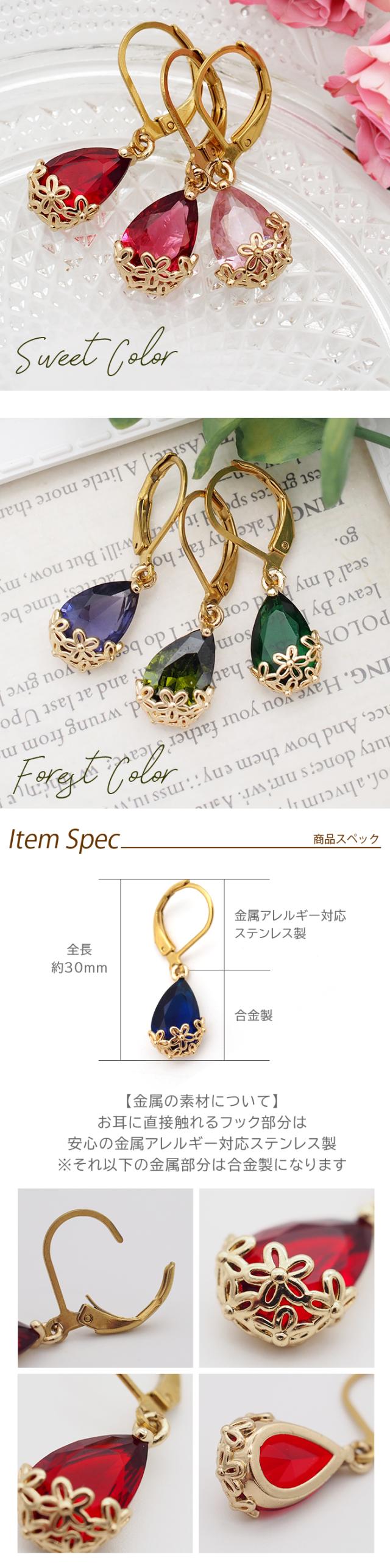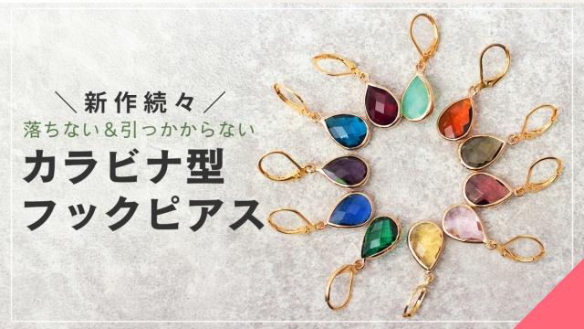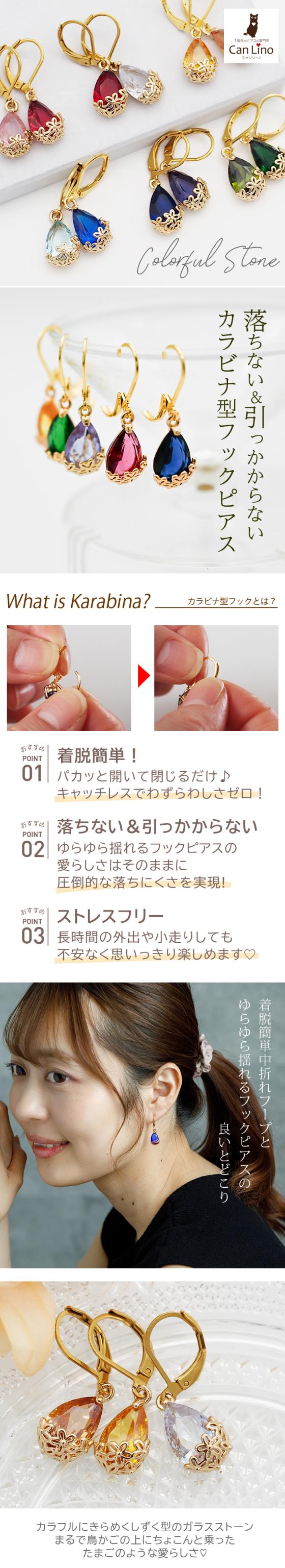 マスクに引っかかりにくいカラビナ型フックピアス 花かごつき カラフルなガラスストーン しずく型 ドロップ 涙 雫 |
