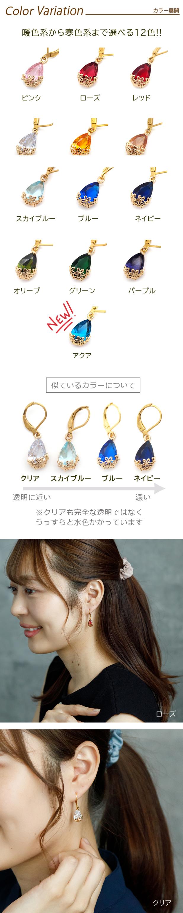 ピアス 金属アレルギー サージカルステンレス フープ 落ちない 引っかからない 外れにくい フック 花かごつき しずく型 カラフル ガラスストーン 全12色