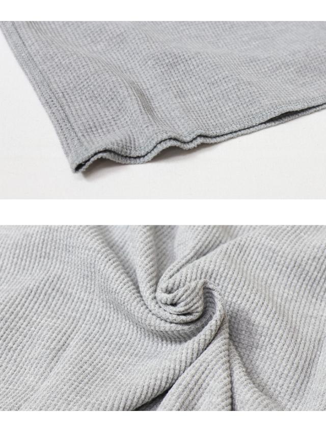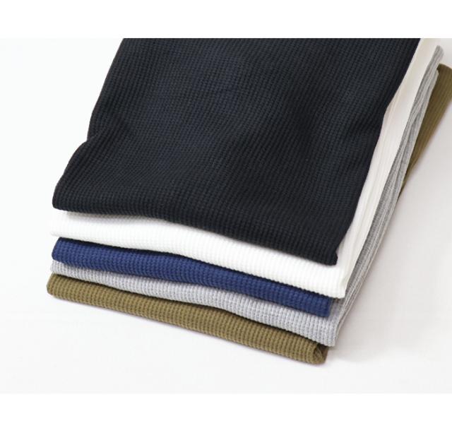 凹凸感のあるワッフル生地を採用。通気性も良くムレにくい万能生地です。シルエットはやや細身ですが、横に程よく伸縮性がある素材なのでカラダのシルエットに合わせてやさしくフィットしてくれます。