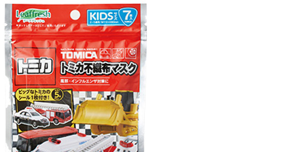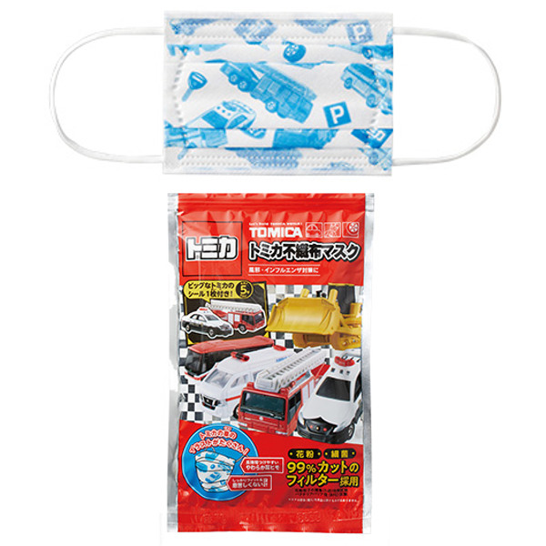 かっこいいトミカがデザインされた子ども用不織布マスクです。かっこいいマスクだけでなく、トミカのビッグシールがおまけで1枚付いてきます。マスクを嫌がってしまうお子さまでも、お気に入りのキャラクターと一緒なら、楽しくマスクを着けられます。花粉症、風邪対策はもちろん、小学校の給食当番用などにもピッタリです。