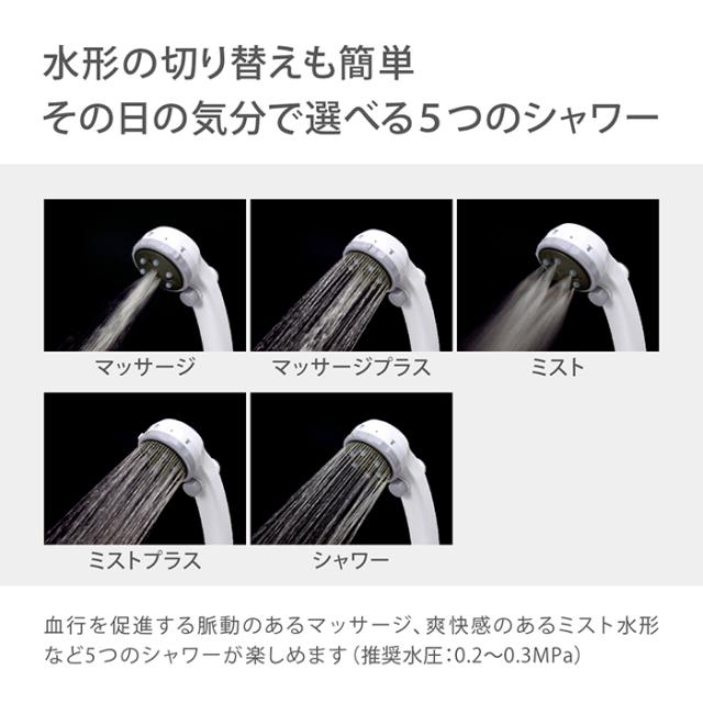 血行を促進する脈動のあるマッサージ、爽快感のあるミストなど5つのシャワーが楽しめます。
