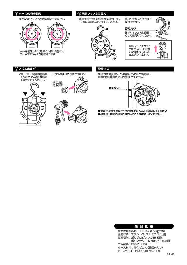 ・飲用および食品加工などの用途には使用しないでください。ホースは塩化ビニル樹脂製のためホースを通した水に臭いがつく場合があります。