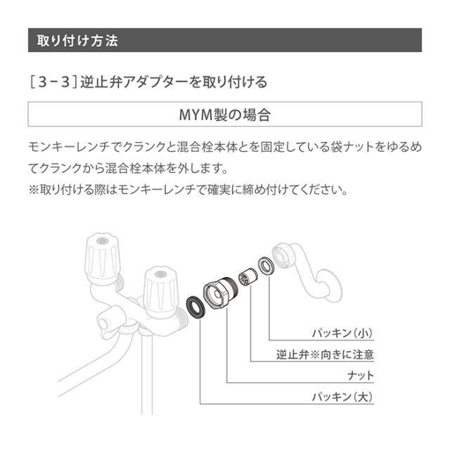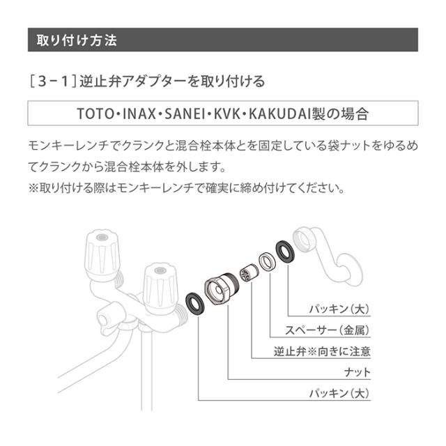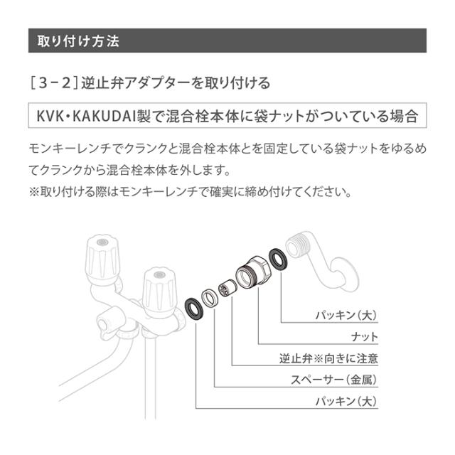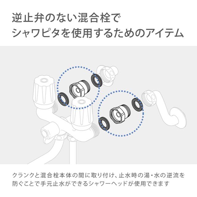逆止弁のない壁付2ハンドル混合栓(シャワバス形)にJS430/435シャワピタを使用する際にお使いいただけるアイテムです。クランクと混合栓本体の間に取り付け、止水時の湯・水の逆流を防ぎます。