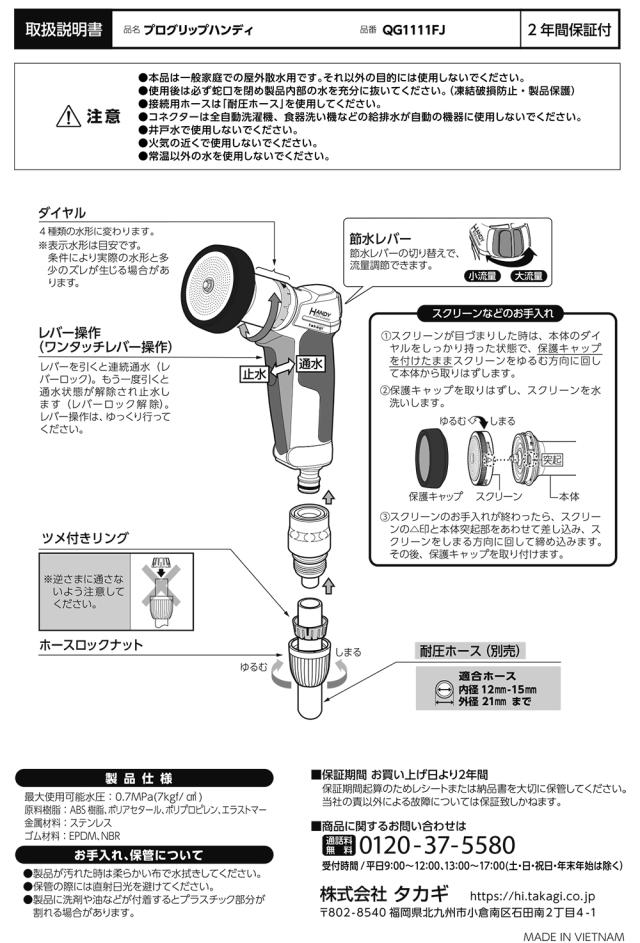 散水ノズル ホースノズル ホースリール ガーデニング 洗車 水やり 4水形 水量調整 シャワー ジョウロ ストレート カクサン ジェット タカギ takagi コネクター付き 公式 2年間保証 QG1111FJ プログリップハンディ ホワイト ホース内径12-15mm/外径21mm